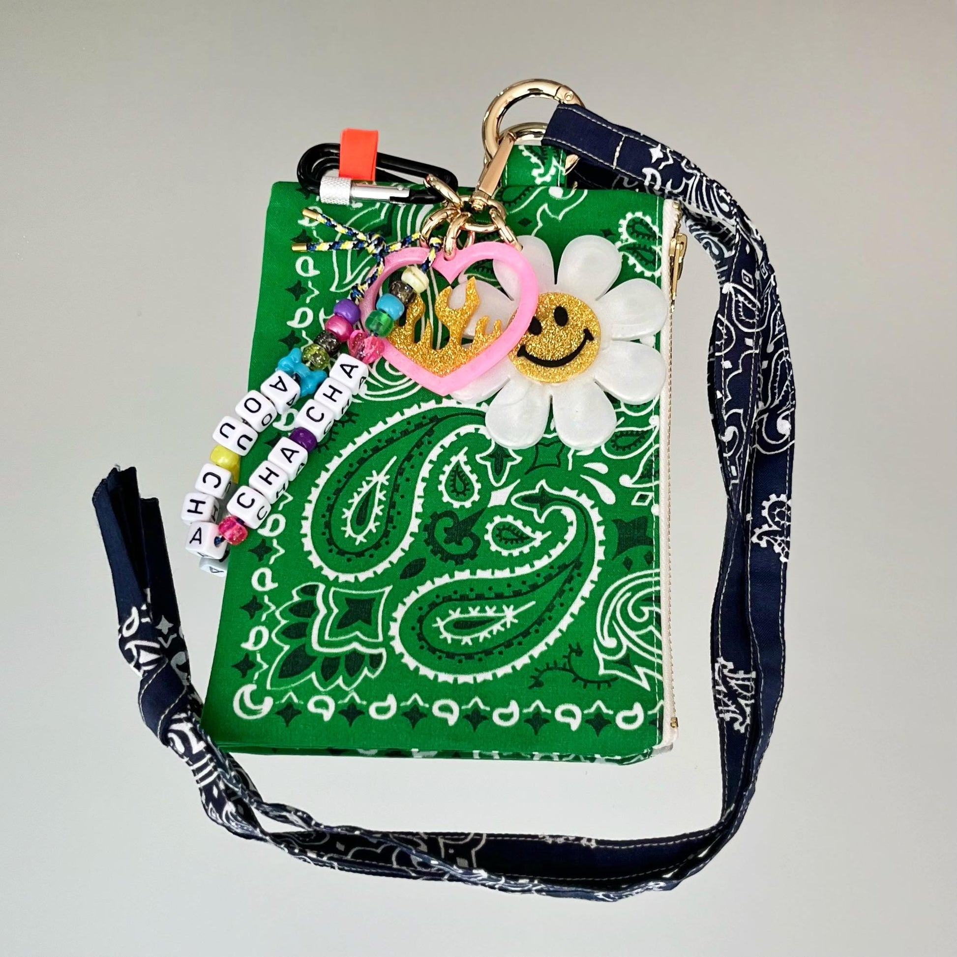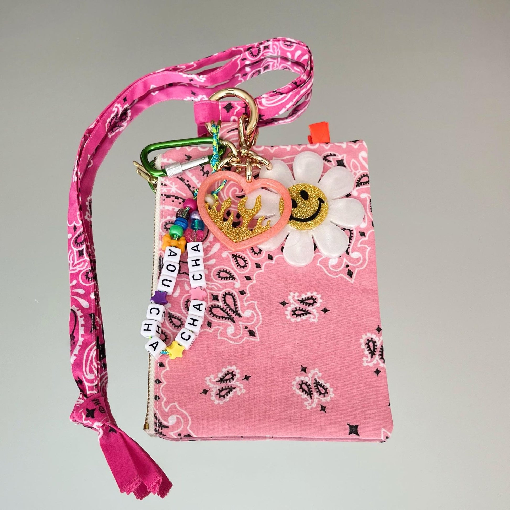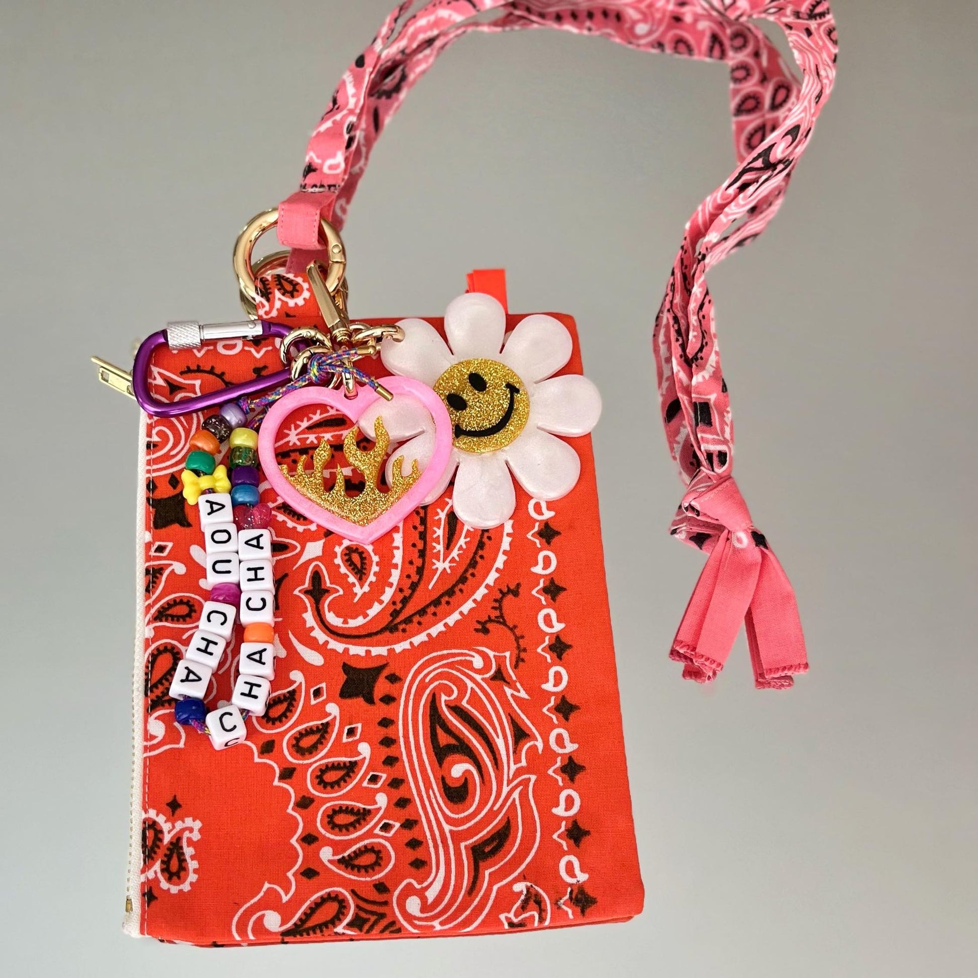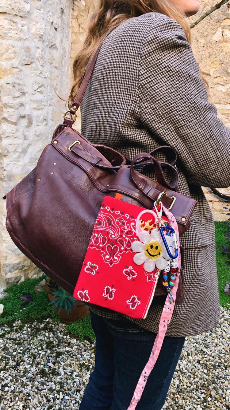 Ils sont composés de 5 élements, une fleur smiley et un coeur enflammé en résine époxy, réalisés entièrement à la main, une petite cordelette avec des perles colorées et l'inscription "AOU CHA CHA CHA", un mousqueton, ET une pochette Klipette, de la marque Kombinaison, les Klipettes se glissent dans votre sac, elles se "klipsent" où vous le souhaitez, et grâce à sa lanière, elles se portent autour de votre cou! Elles sont toutes uniques et faites en séries limitées avec les chutes de bandanas. Elles peuvent donc varier d'un modèle à l'autre, doublure SURPRISE en bandana ;-) (Bandanas 100% coton made in USA, fabriqués de façon traditionnelle à Greenville en Caroline du Sud, depuis 1947).