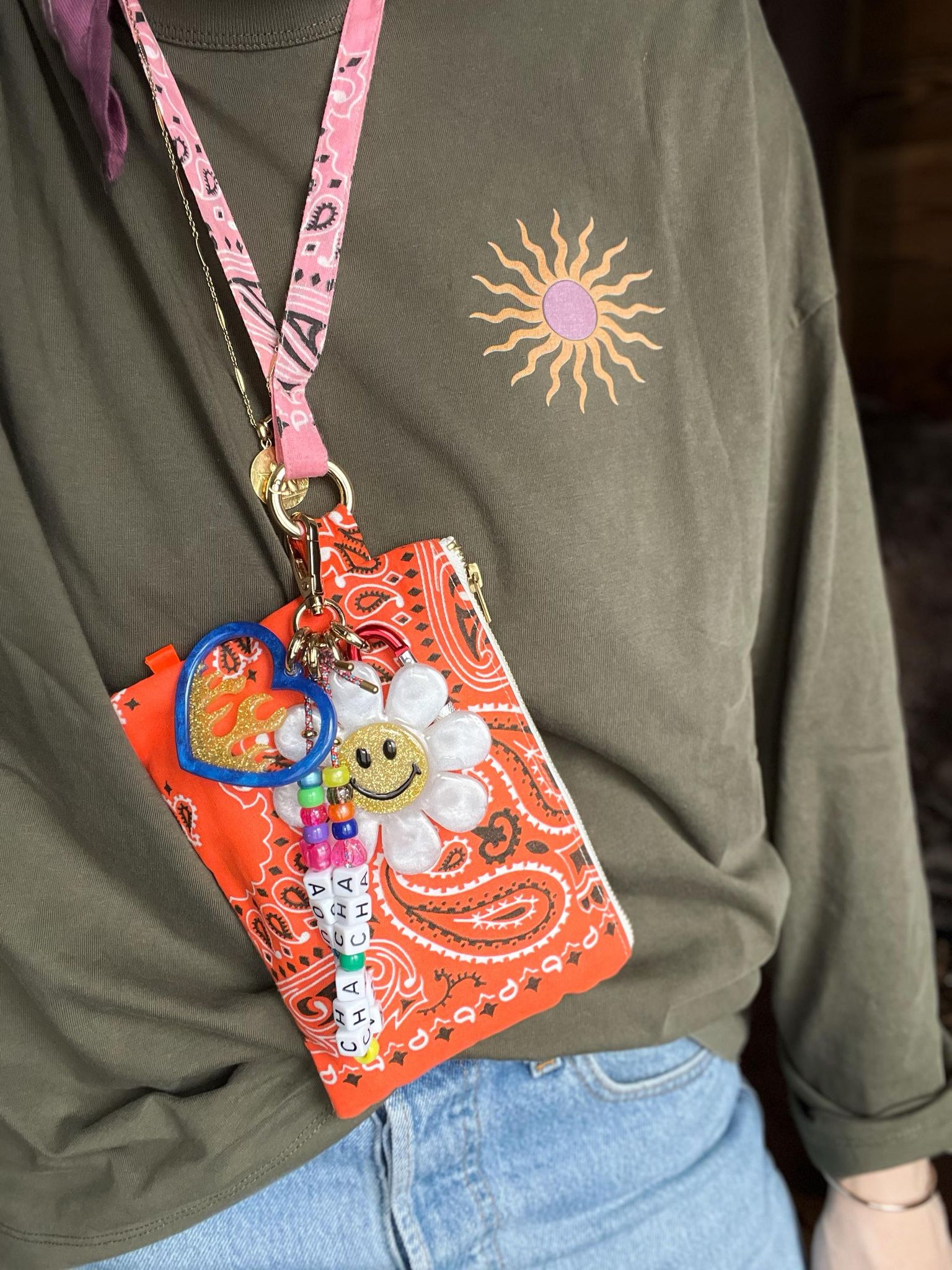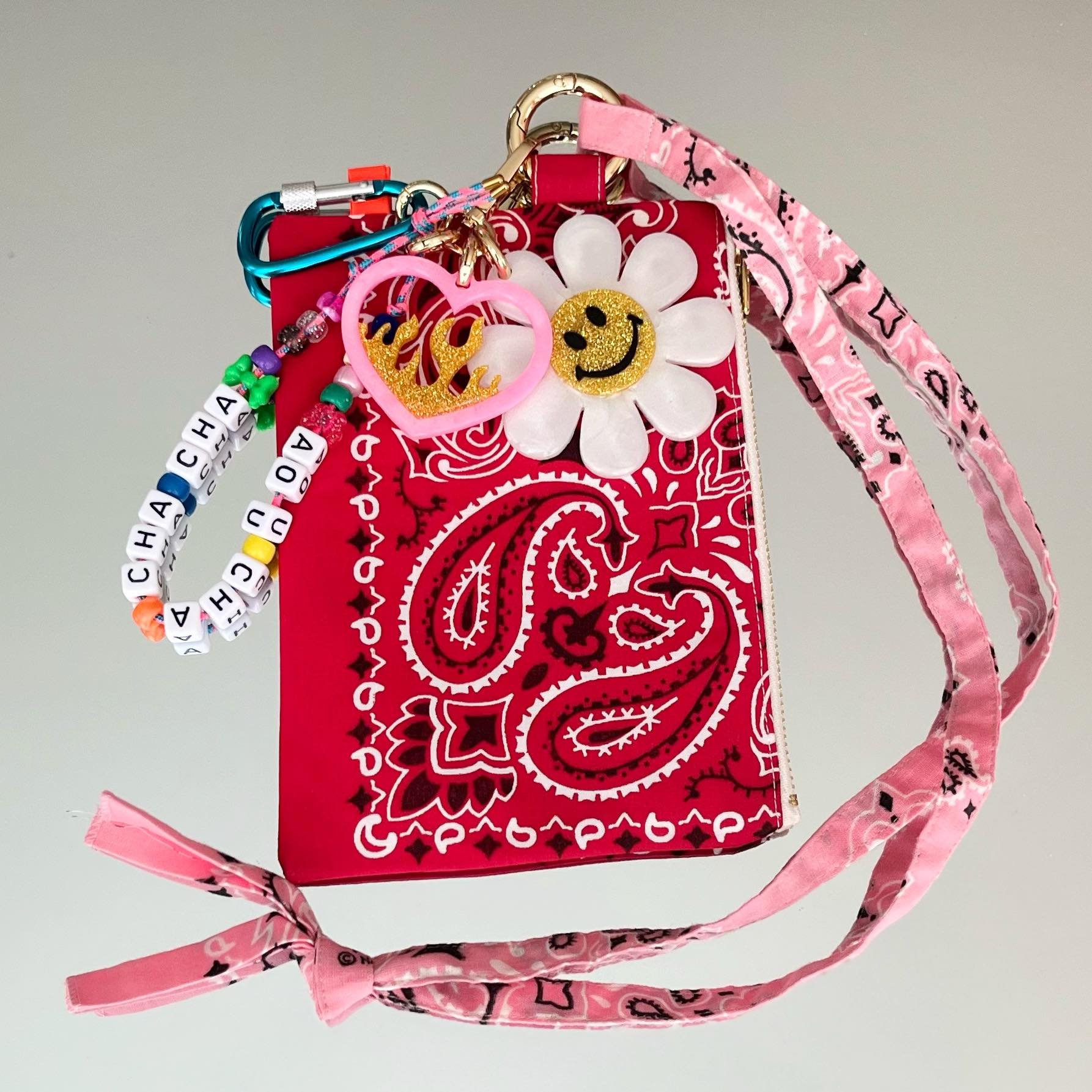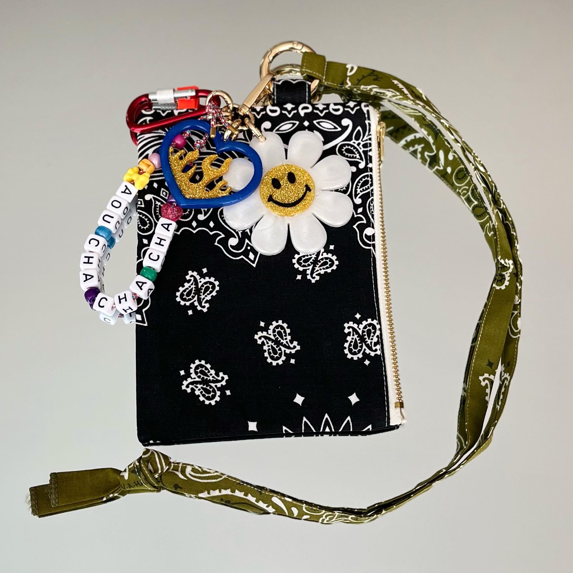 Ils sont composés de 5 élements, une fleur smiley et un coeur enflammé en résine époxy, réalisés entièrement à la main, une petite cordelette avec des perles colorées et l'inscription "AOU CHA CHA CHA", un mousqueton, ET une pochette Klipette, de la marque Kombinaison, les Klipettes se glissent dans votre sac, elles se "klipsent" où vous le souhaitez, et grâce à sa lanière, elles se portent autour de votre cou! Elles sont toutes uniques et faites en séries limitées avec les chutes de bandanas. Elles peuvent donc varier d'un modèle à l'autre, doublure SURPRISE en bandana ;-) (Bandanas 100% coton made in USA, fabriqués de façon traditionnelle à Greenville en Caroline du Sud, depuis 1947).