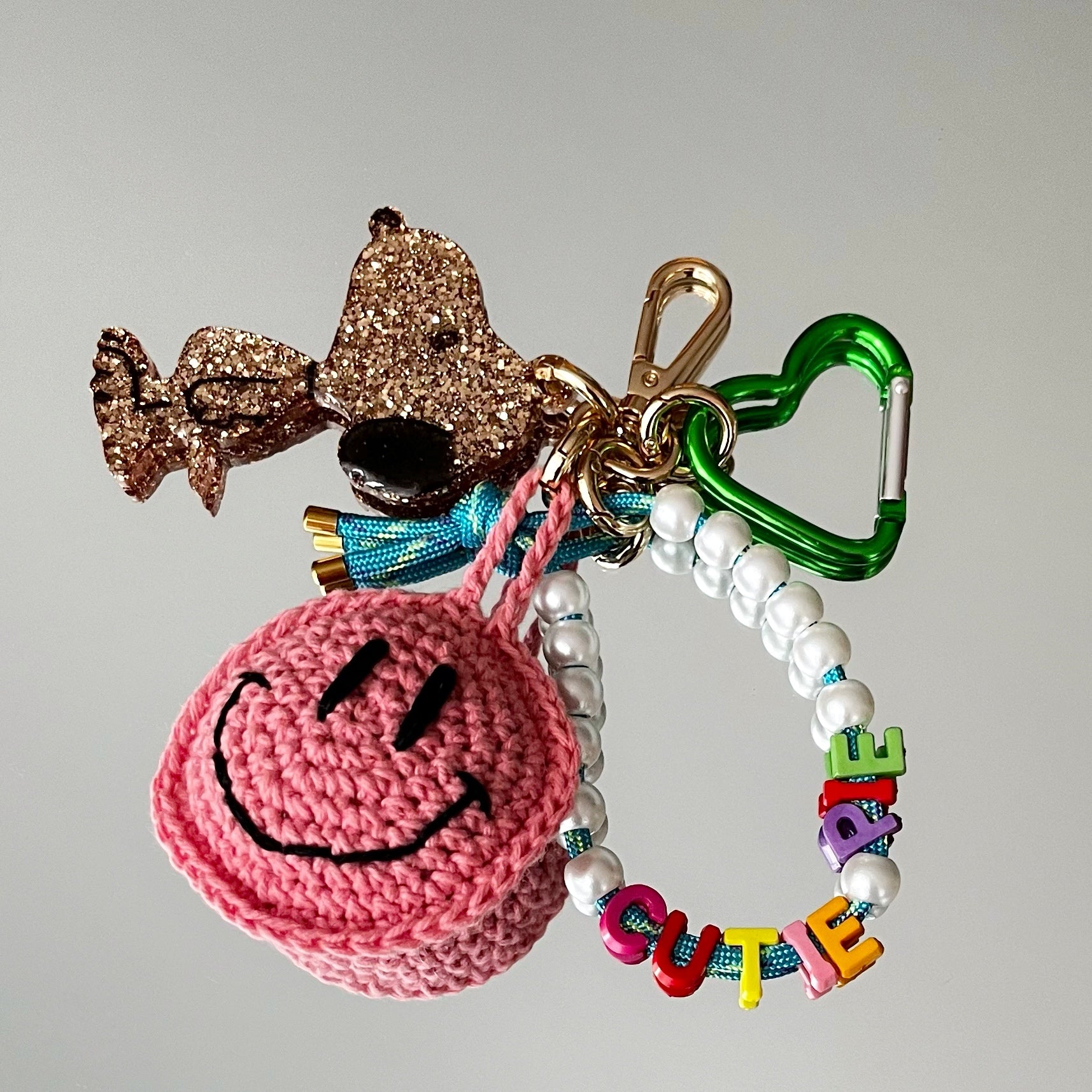 Ce grigri est composé de 4 éléments, 1 pendant en résine époxy, un cordon d'escalade avec des perles colorées et l'inscription "CUTIE PIE", un mousqueton, et un grigri en crochet, tous réalisés à la main (sauf le mousqueton) par mes soins,