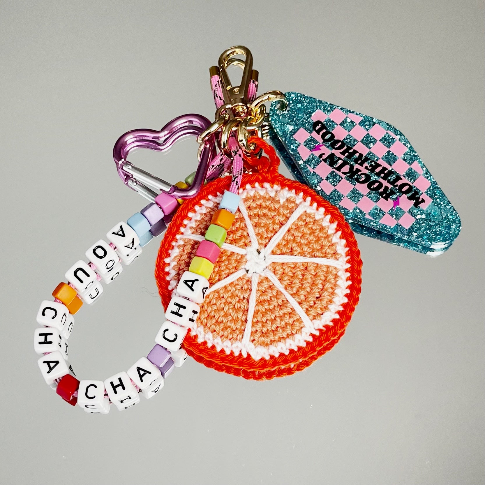 Ce grigri est composé de 4 éléments, 1 pendant en résine époxy, un cordon d'escalade avec des perles colorées et l'inscription "AOU CHA CHA CHA", un mousqueton, et un grigri en crochet, tous réalisés à la main (sauf le mousqueton) par mes soins,