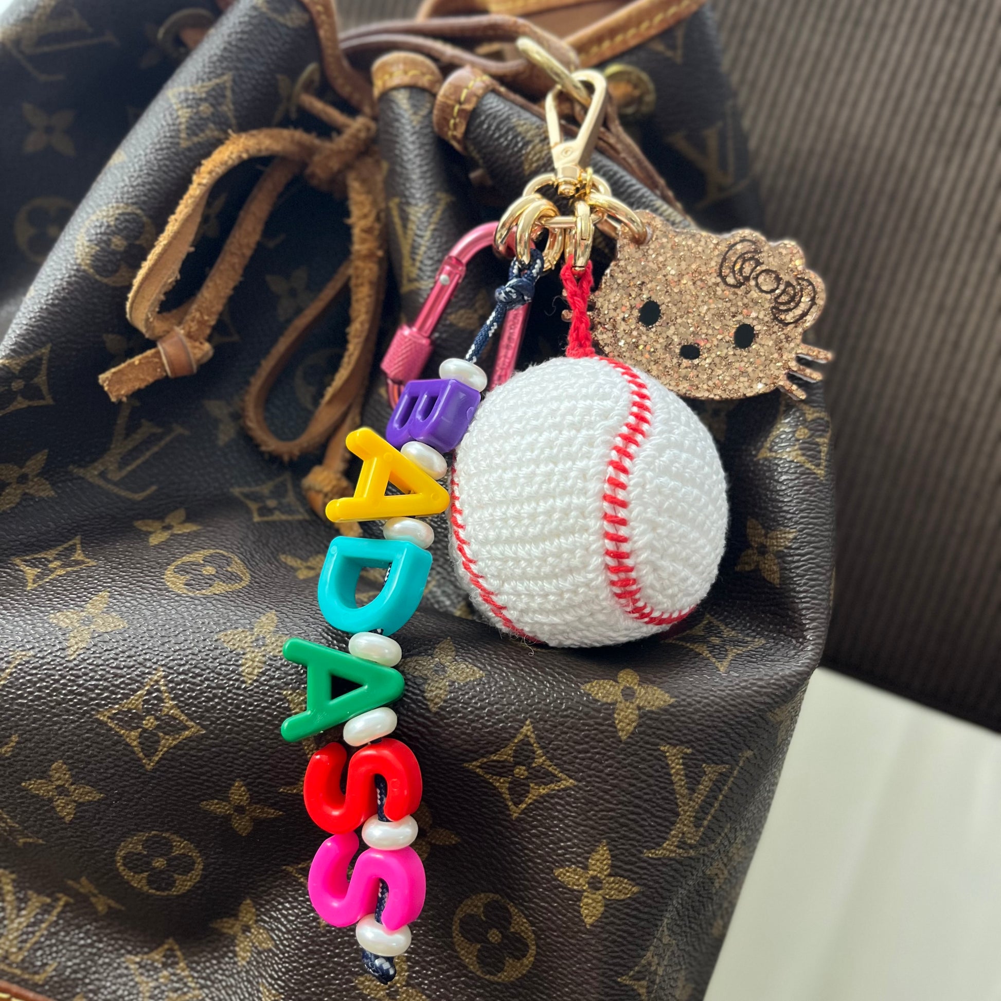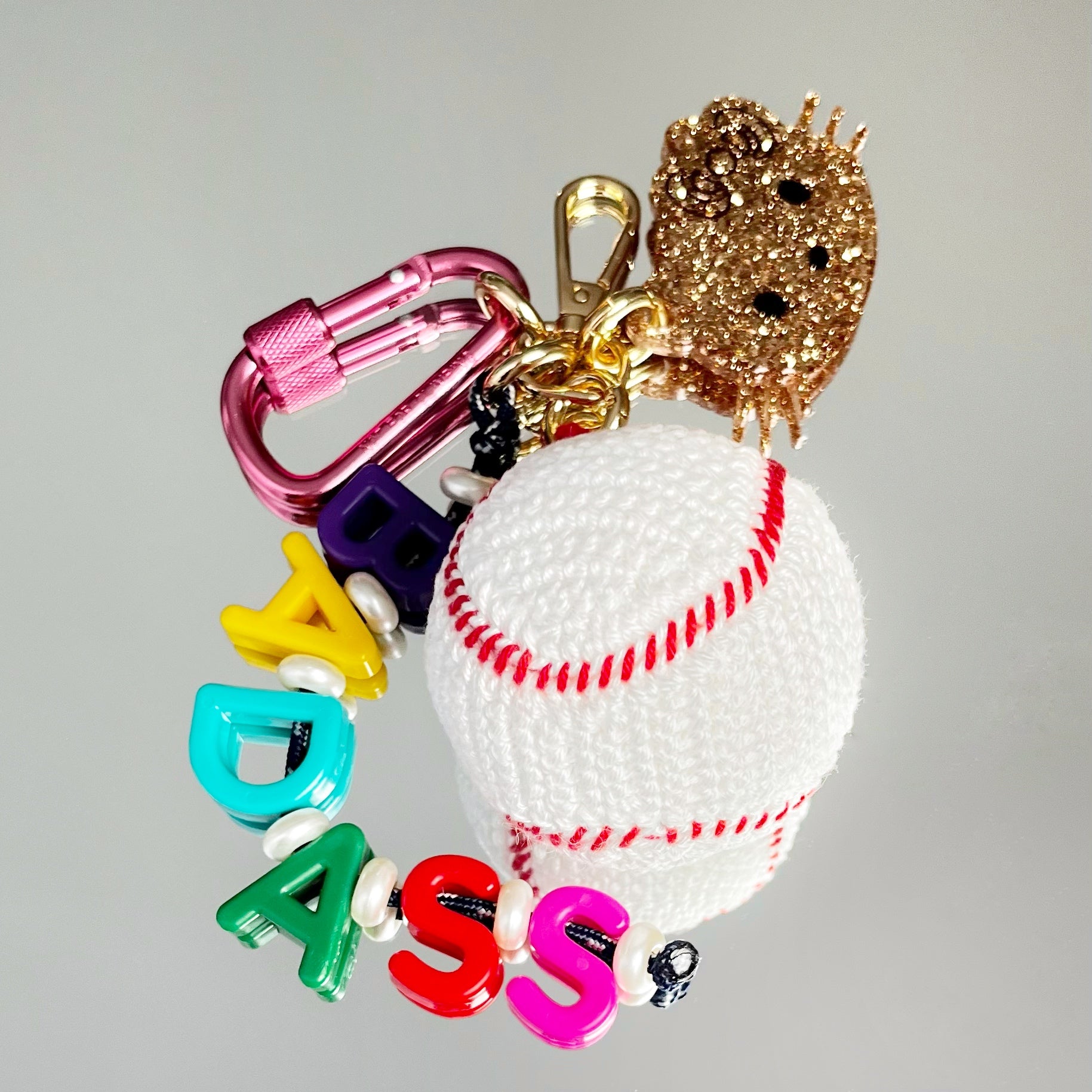 Ce grigri est composé de 4 éléments, 1 pendant en résine époxy, un cordon d'escalade avec des perles colorées et l'inscription "BADASS", un mousqueton, et un grigri en crochet, tous réalisés à la main (sauf le mousqueton) par mes soins,