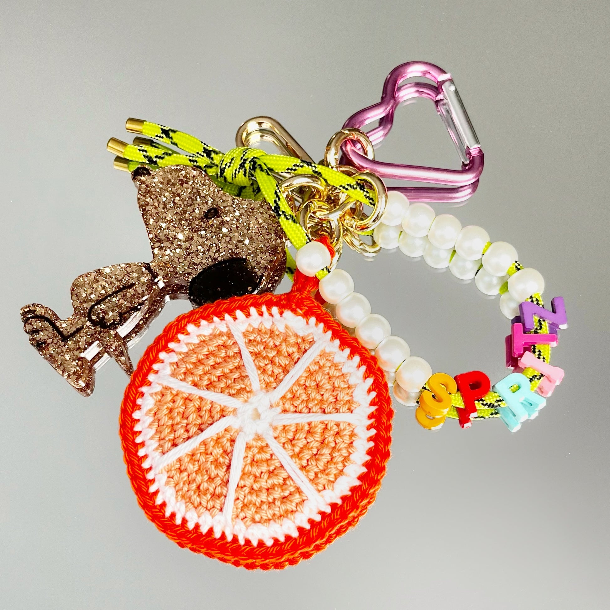 Ce grigri est composé de 4 éléments, 1 pendant en résine époxy, un cordon d'escalade avec des perles colorées et l'inscription "SPRITZ", un mousqueton, et un grigri en crochet, tous réalisés à la main (sauf le mousqueton) par mes soins,