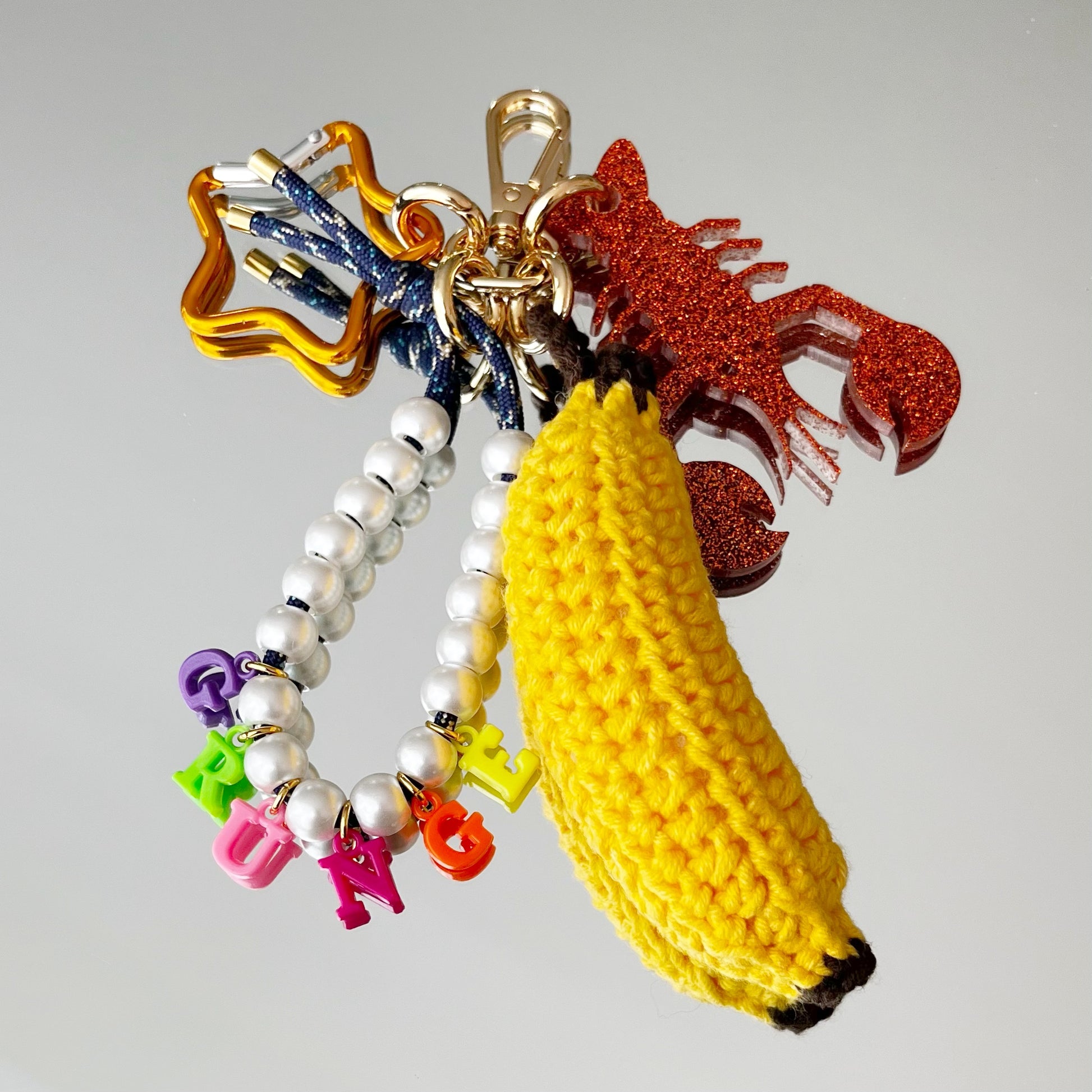 Ce grigri est composé de 4 éléments, 1 pendant en résine époxy, un cordon d'escalade avec des perles colorées, un mousqueton, et un grigri en crochet, tous réalisés à la main (sauf le mousqueton) par mes soins,