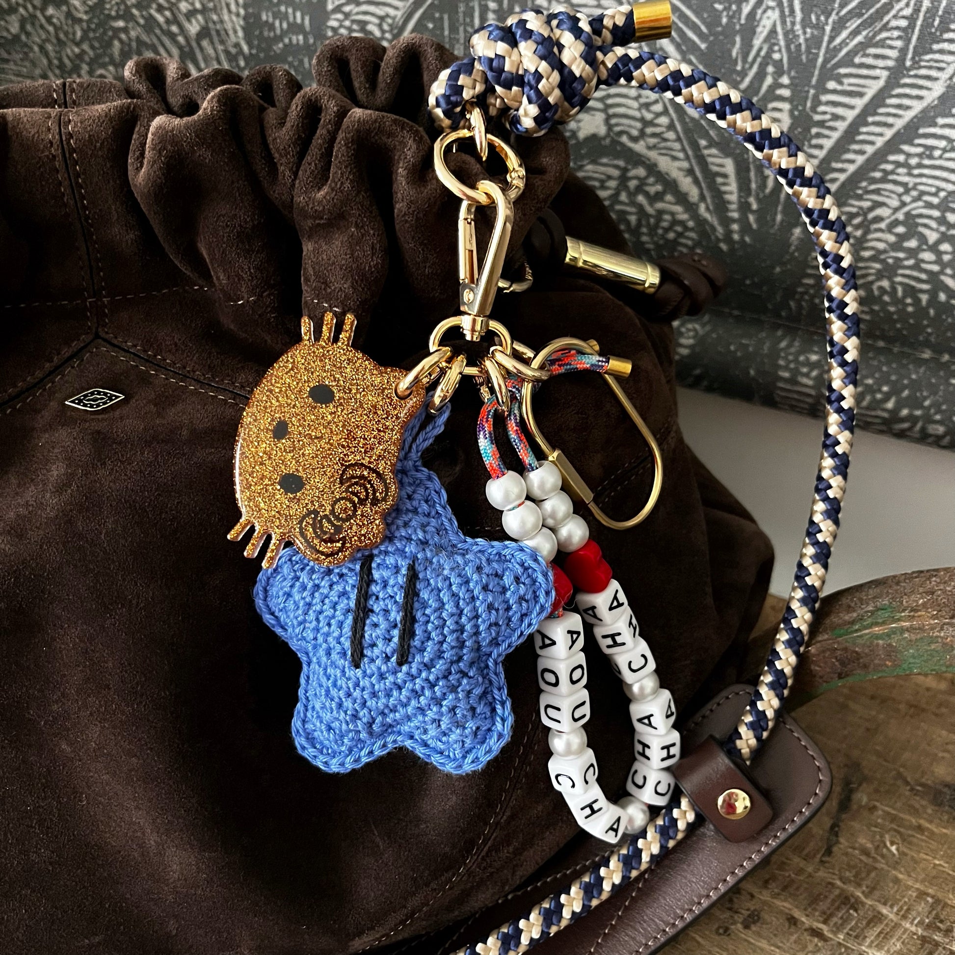 Ce grigri est composé de 4 éléments : un pendentif en résine époxy, un cordon d’escalade orné de perles, un mousqueton et un grigri en crochet, tous réalisés à la main avec soin (à l’exception du mousqueton).