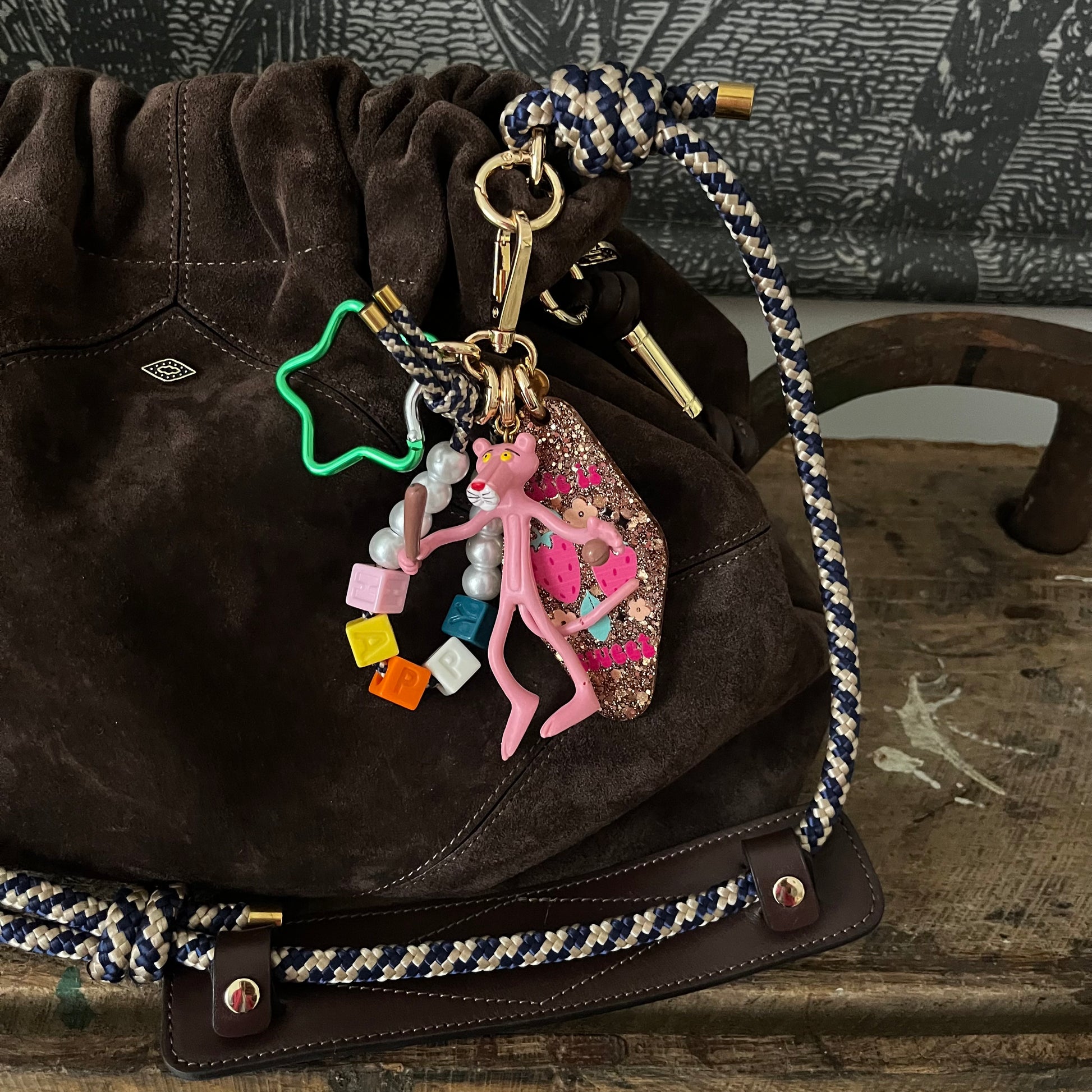 Tous sont fabriqués à la main par mes soins, à l’exception du mousqueton et du jouet.