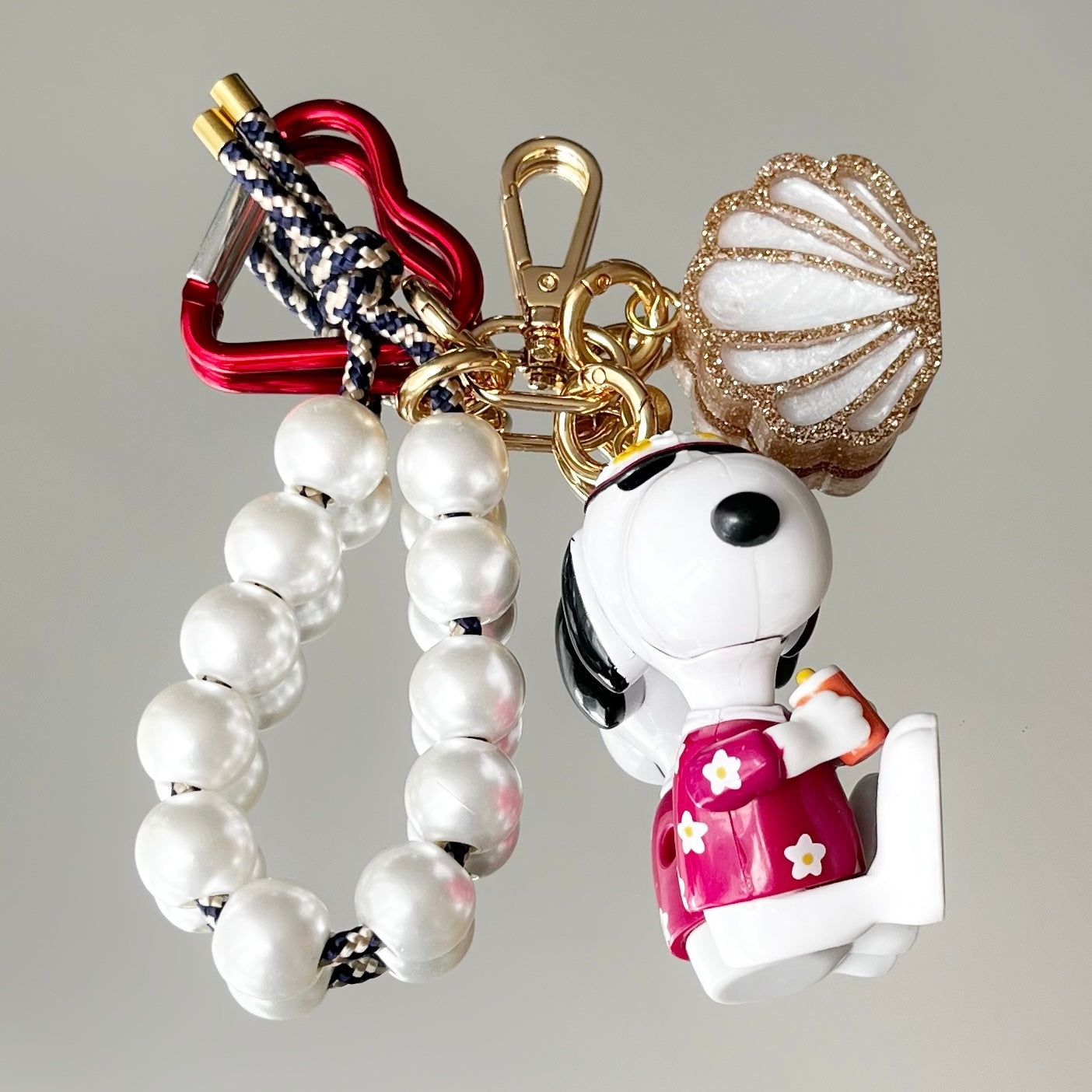 Ce grigri est composé de 4 éléments : un pendentif en résine époxy, un cordon d’escalade orné de perles, un mousqueton et un petit jouet que j'ai soigneusement chiné.