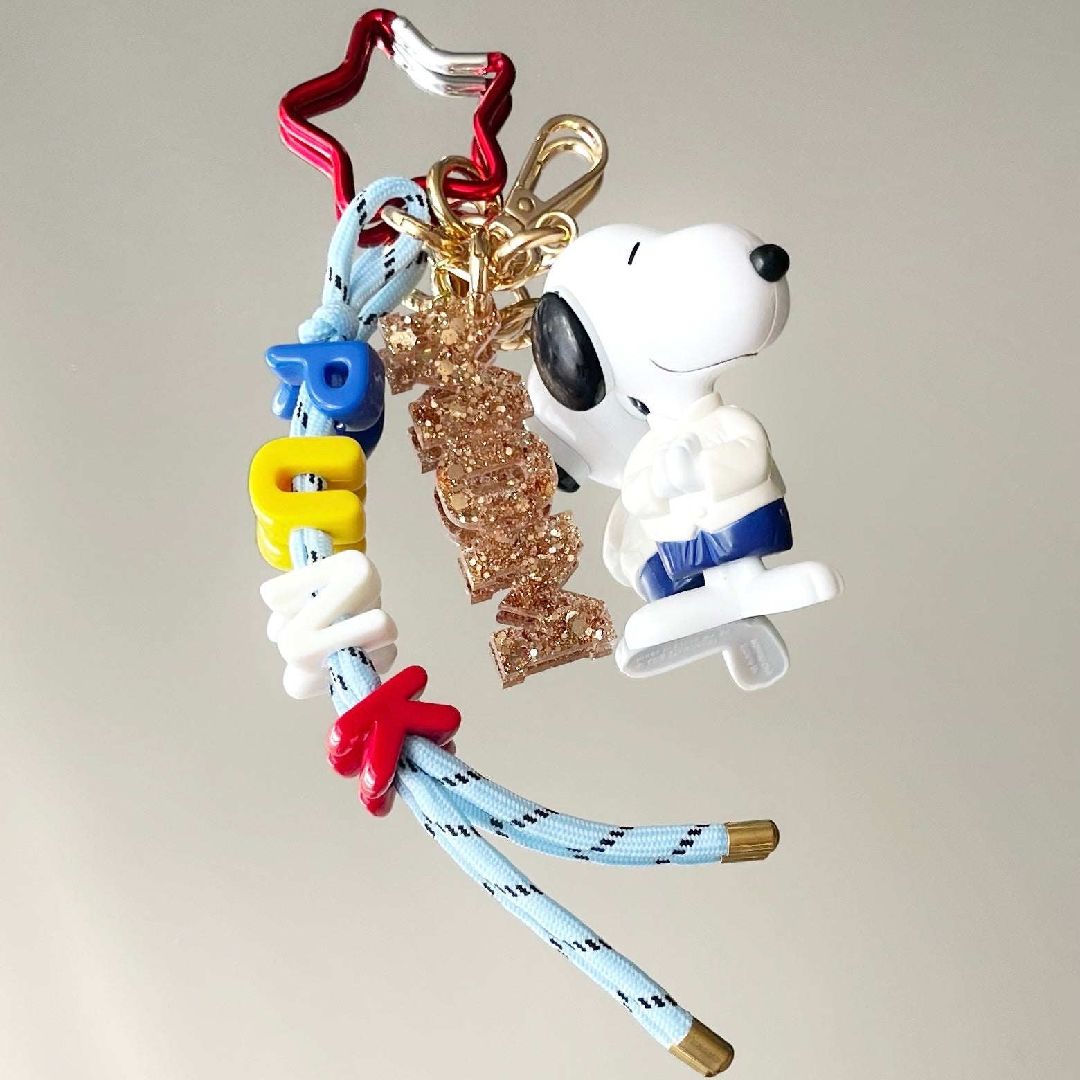 Ce grigri est composé de 4 éléments : un pendentif en résine époxy, un cordon d’escalade orné de perles, un mousqueton et un petit jouet que j'ai soigneusement chiné.