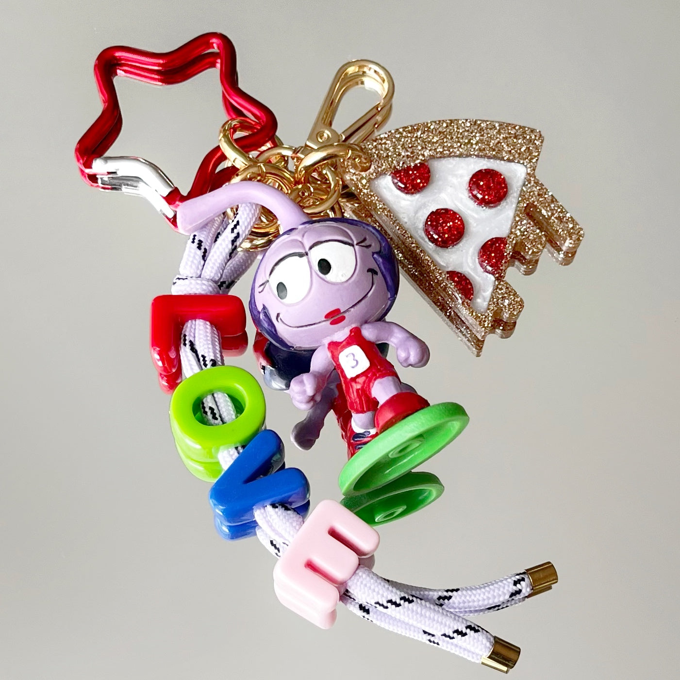 Ce grigri est composé de 4 éléments : un pendentif en résine époxy, un cordon d’escalade orné de perles, un mousqueton et un petit jouet que j'ai soigneusement chiné.