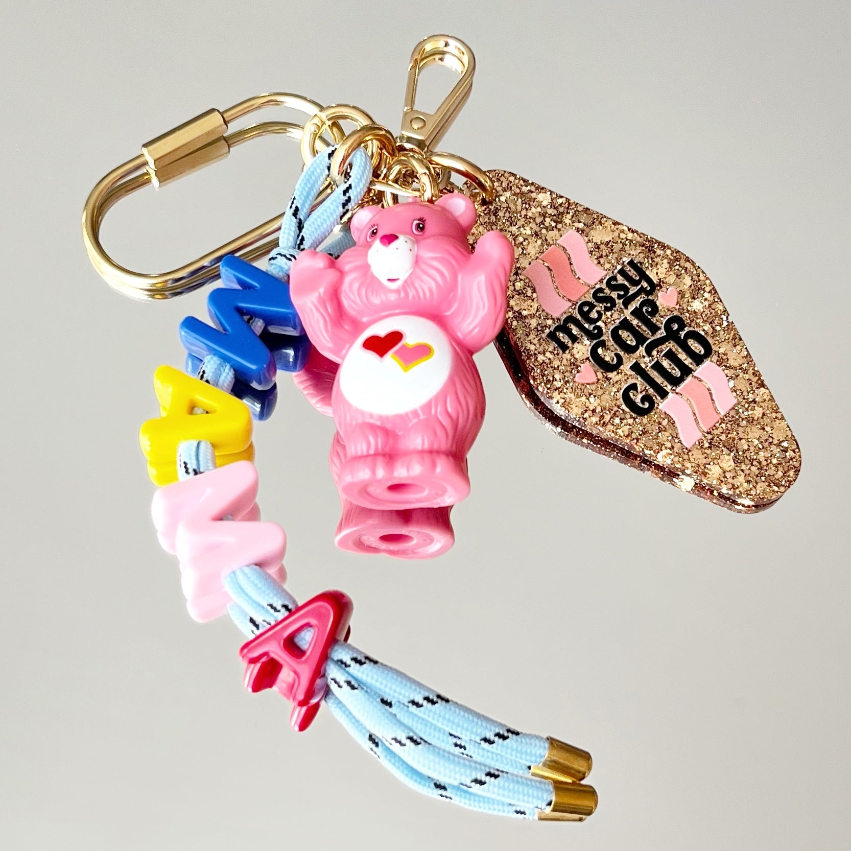 Tous sont fabriqués à la main par mes soins, à l’exception du mousqueton et du jouet.