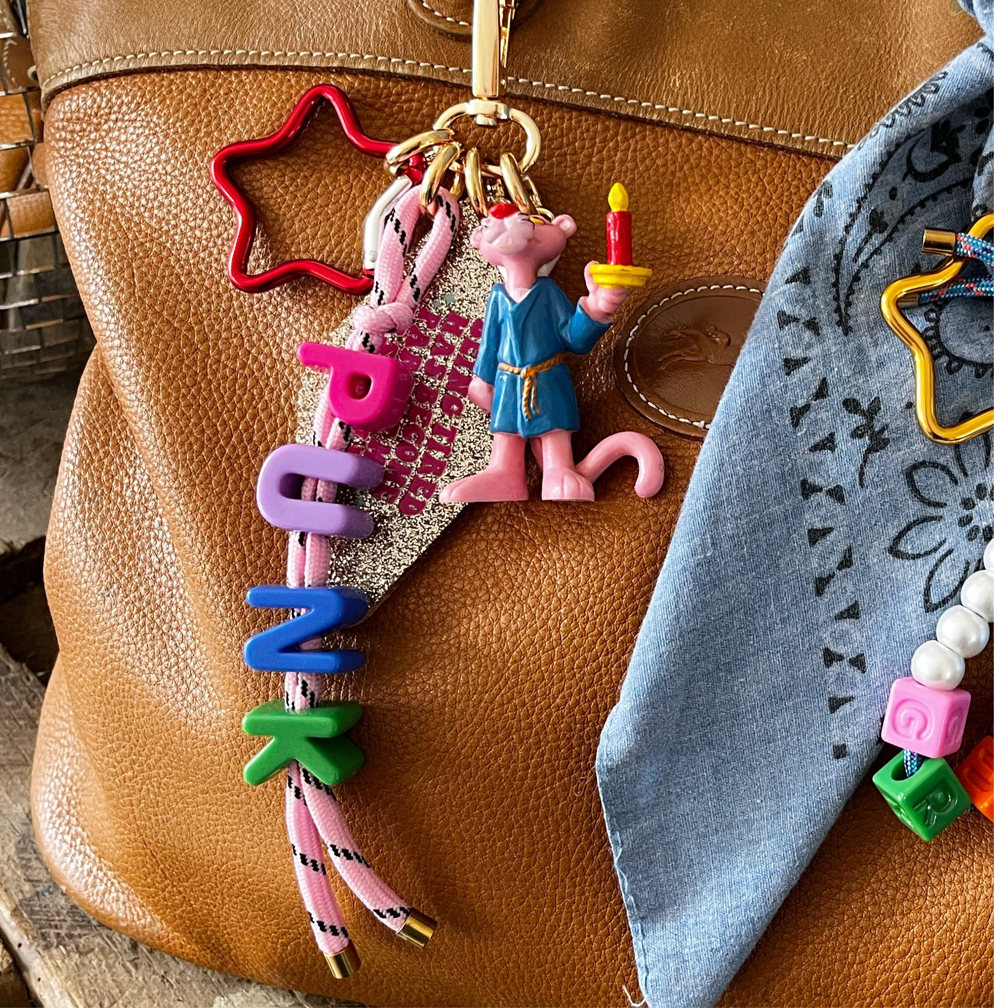 Tous sont fabriqués à la main par mes soins, à l’exception du mousqueton et du jouet.