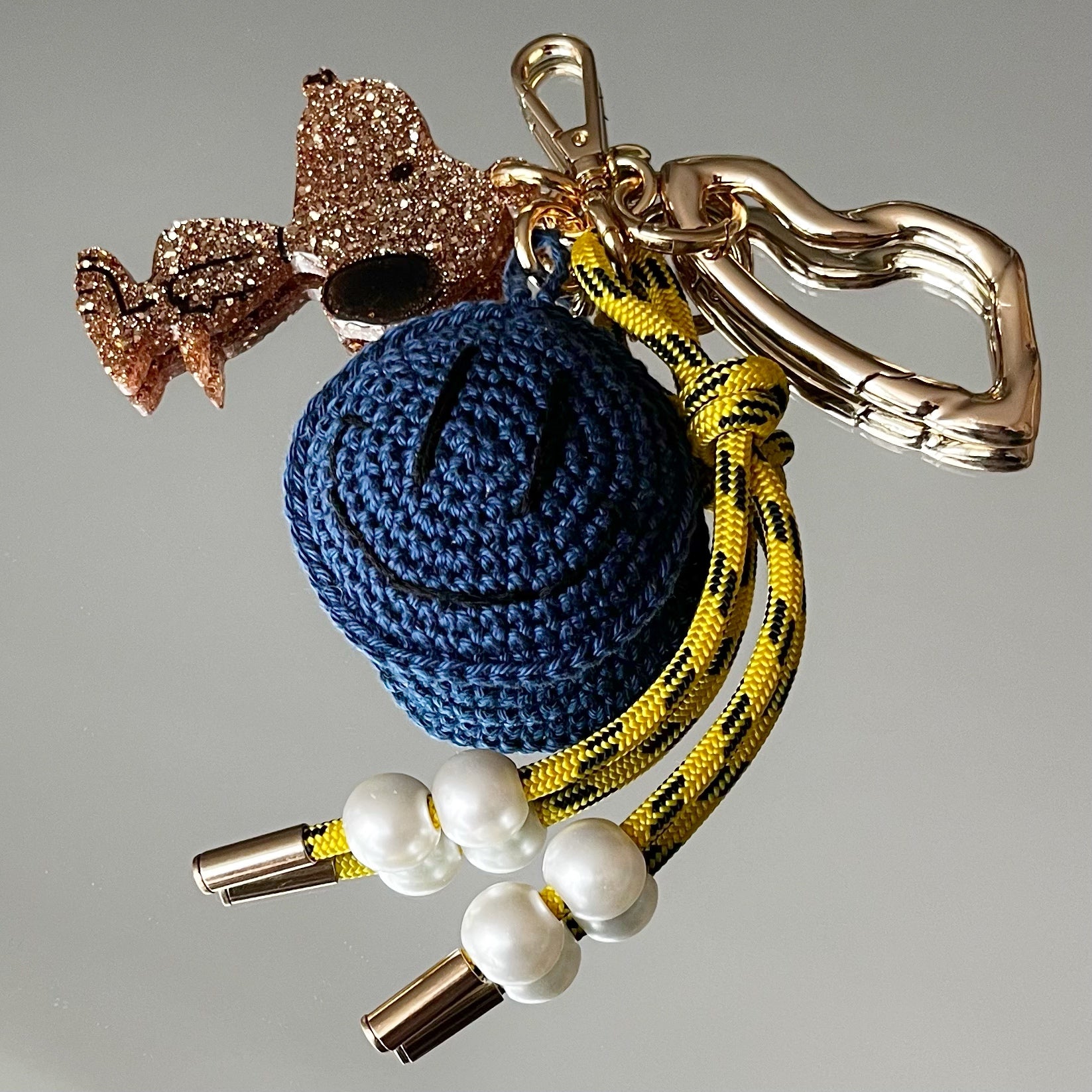 Ce grigri est composé de 4 éléments, 1 pendant en résine époxy, un cordon d'escalade avec des perles, un mousqueton, et un grigri en crochet, tous réalisés à la main (sauf le mousqueton) par mes soins,
