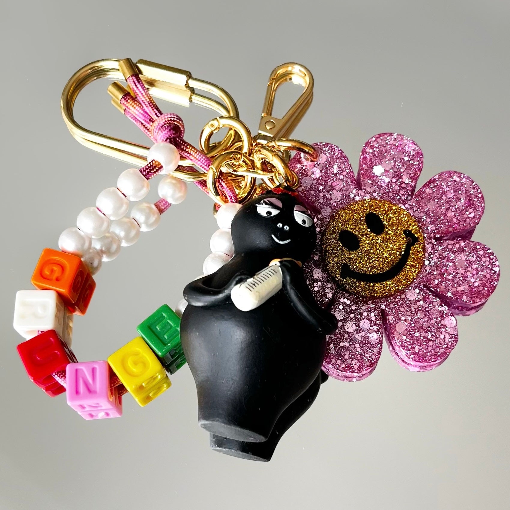 Tous sont fabriqués à la main par mes soins, à l’exception du mousqueton et du jouet.