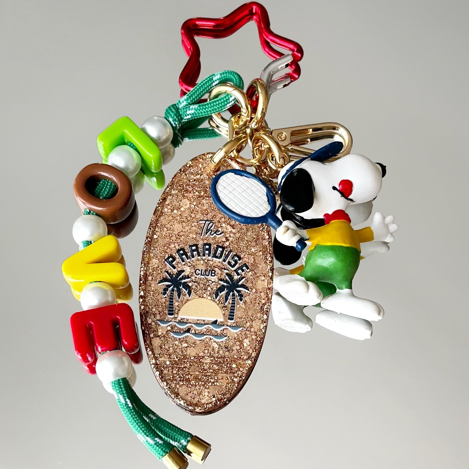 Ce grigri est composé de 4 éléments : un pendentif en résine époxy, un cordon d’escalade orné de perles, un mousqueton et un petit jouet que j'ai soigneusement chiné.