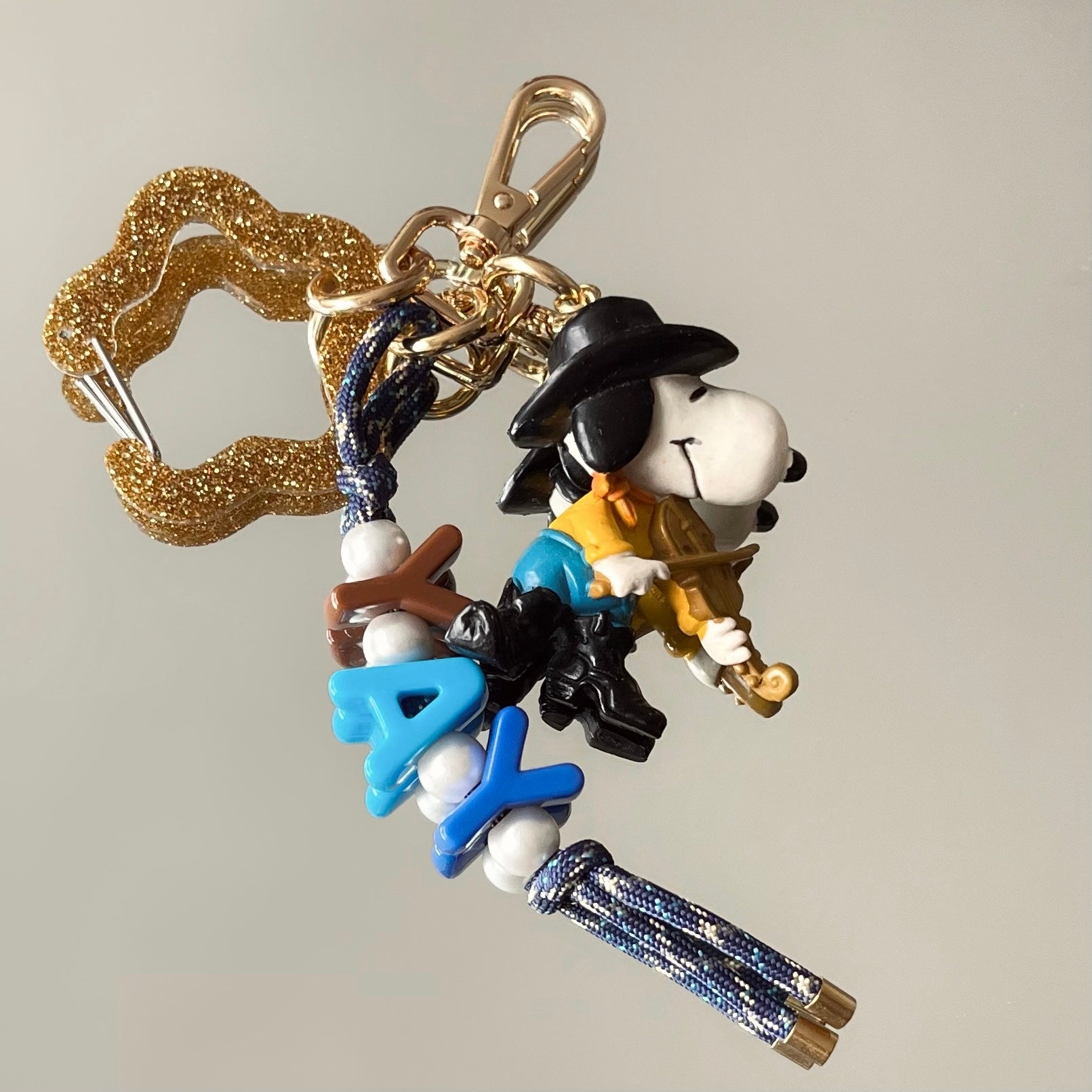 Ce grigri est composé de 3 éléments : un mousqueton en résine époxy, un cordon d’escalade orné de perles et un petit jouet que j'ai soigneusement chiné.