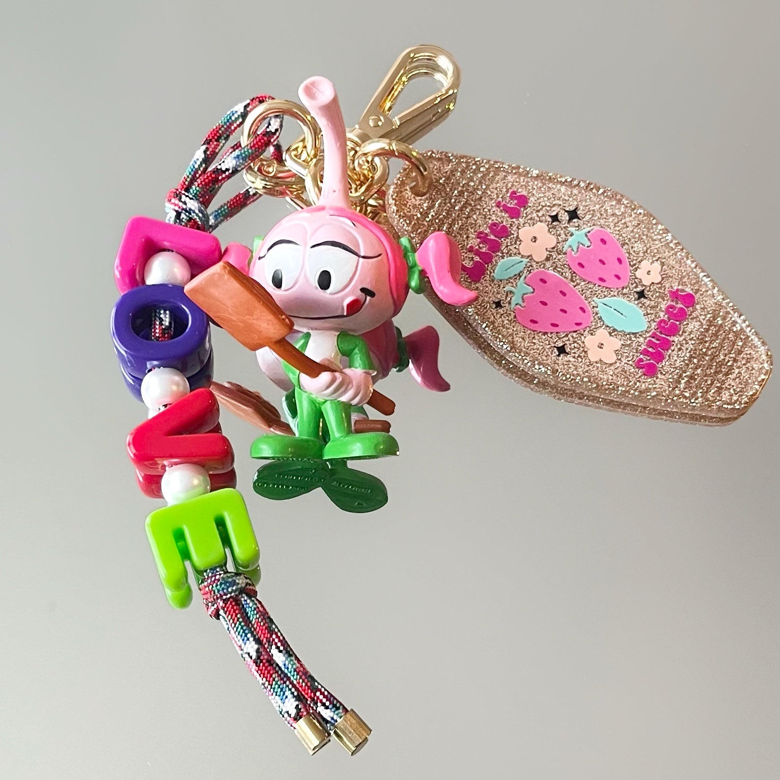 Ce grigri est composé de 3 éléments : un pendant en résine époxy, un cordon d’escalade orné de perles et un petit jouet que j'ai soigneusement chiné.