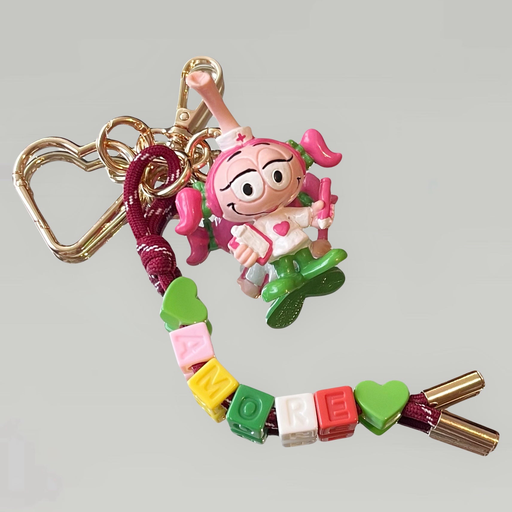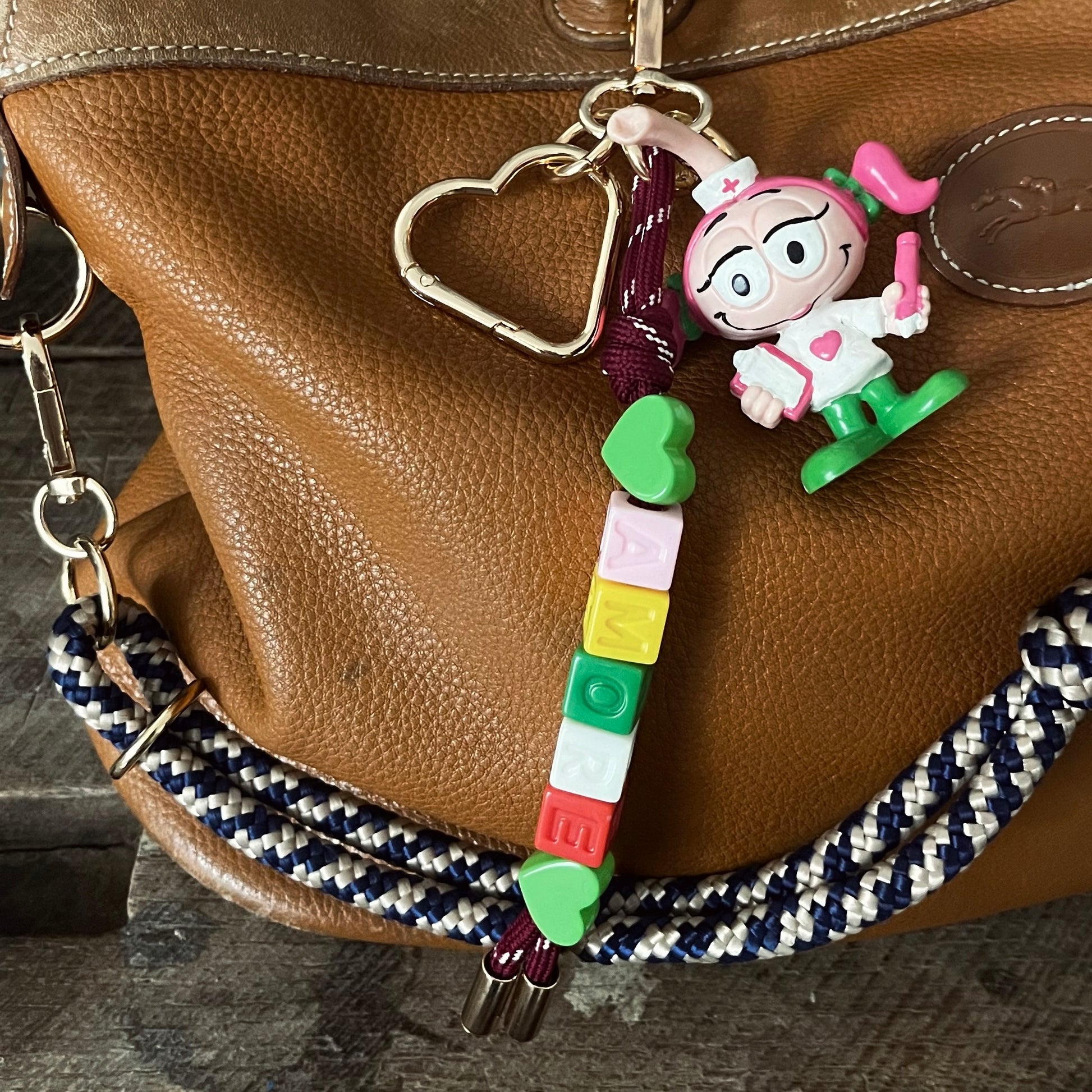 Ce grigri se compose de trois éléments : un mousqueton, un cordon d’escalade orné de perles, et un petit jouet soigneusement chiné.