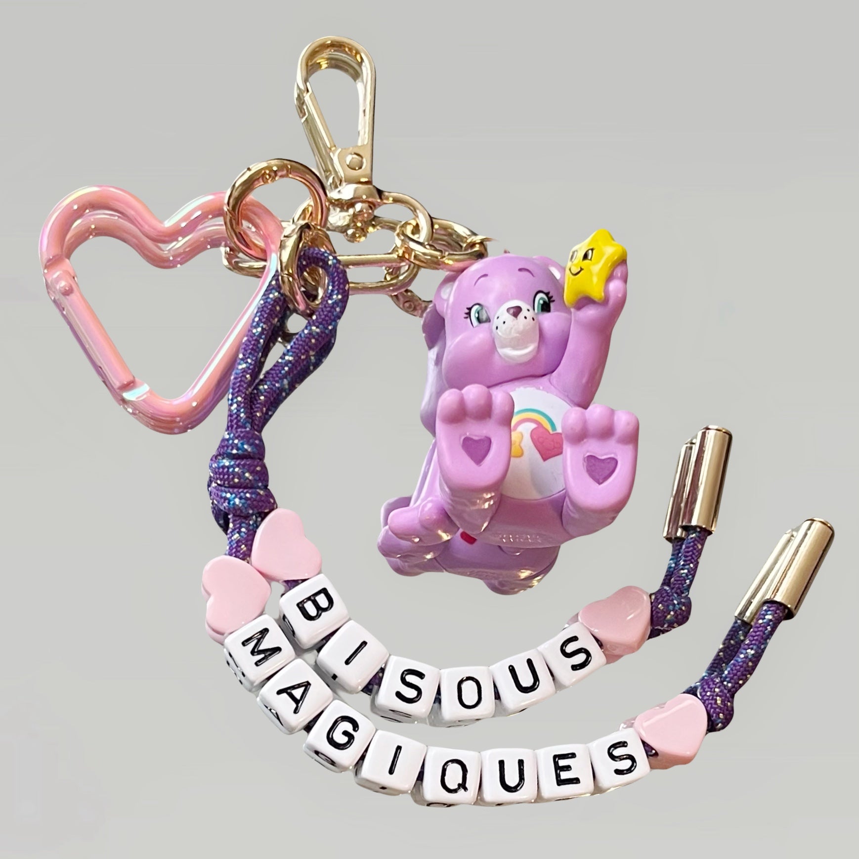 Ce grigri se compose de trois éléments : un mousqueton, un cordon d’escalade orné de perles, et un petit jouet soigneusement chiné.