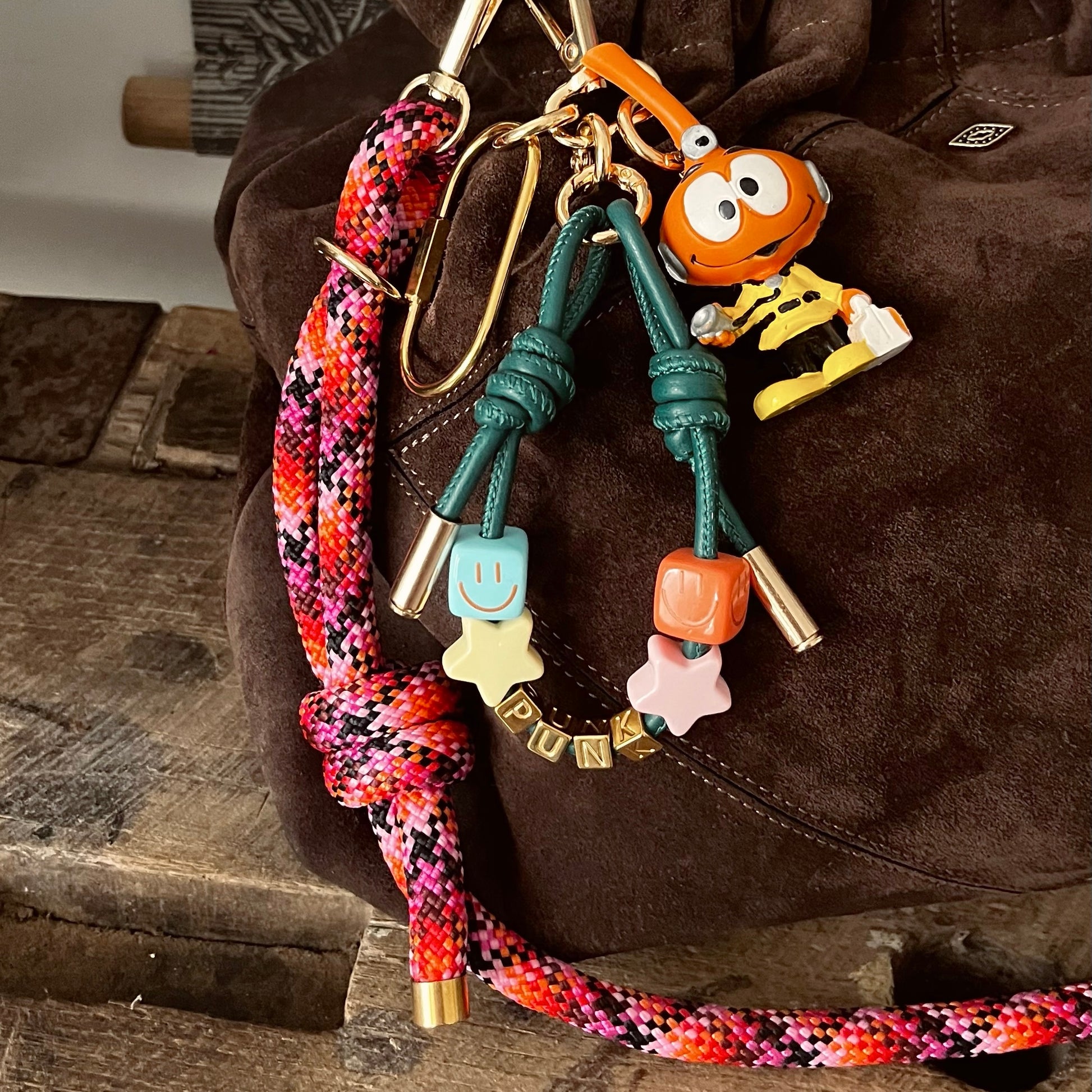 Ce grigri se compose de trois éléments : un mousqueton, un cordon en simili cuir orné de perles, et un petit jouet soigneusement chiné.