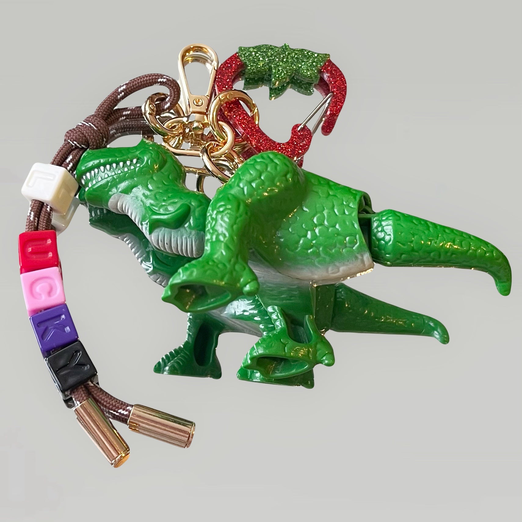 Ce grigri se compose de trois éléments : un mousqueton, un cordon d’escalade orné de perles, et un petit jouet soigneusement chiné.