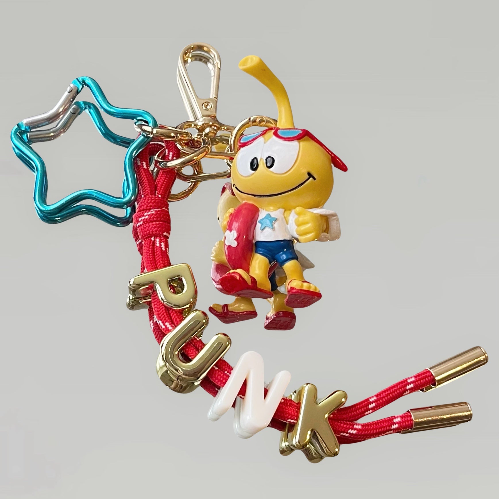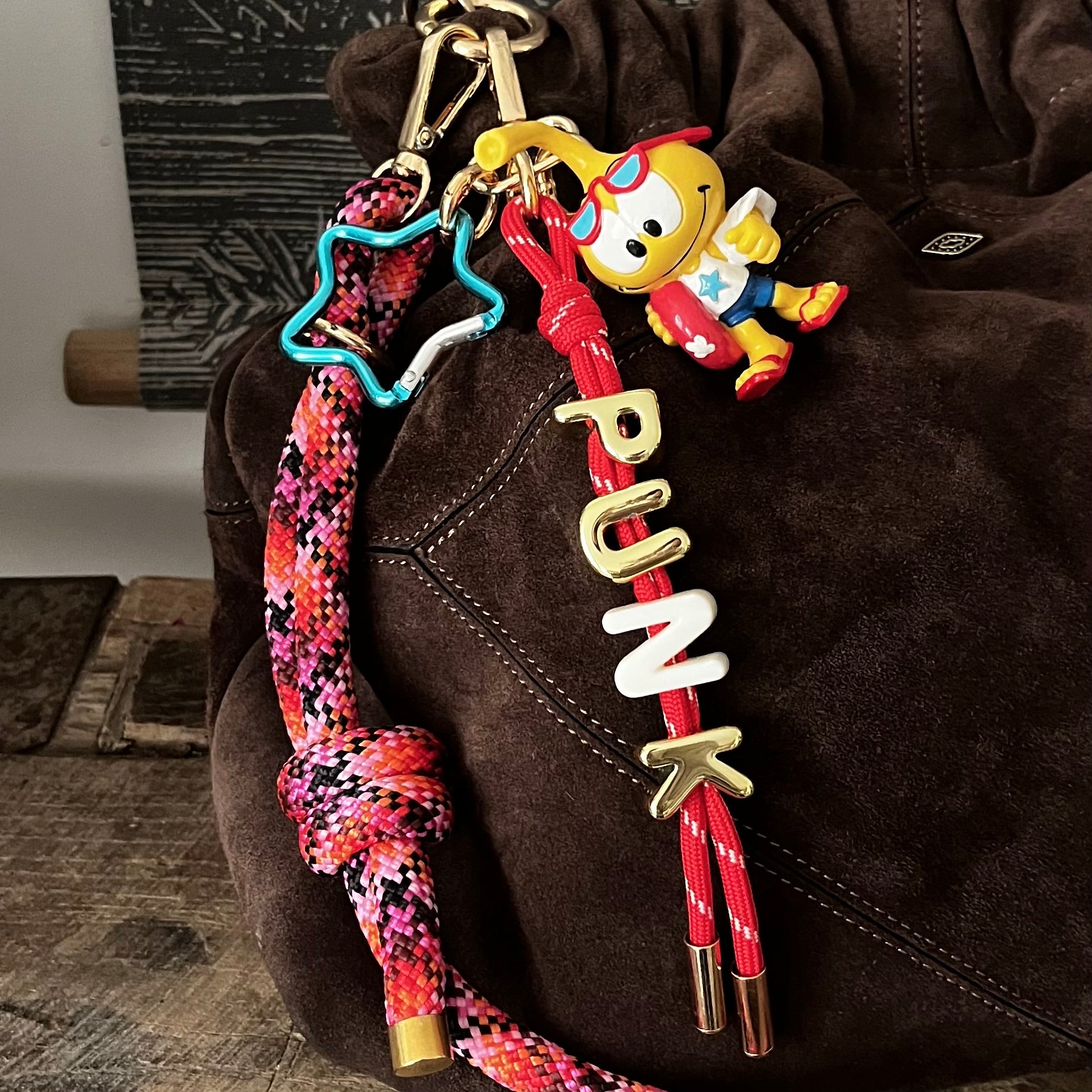 Ce grigri se compose de trois éléments : un mousqueton, un cordon d’escalade orné de perles, et un petit jouet soigneusement chiné.