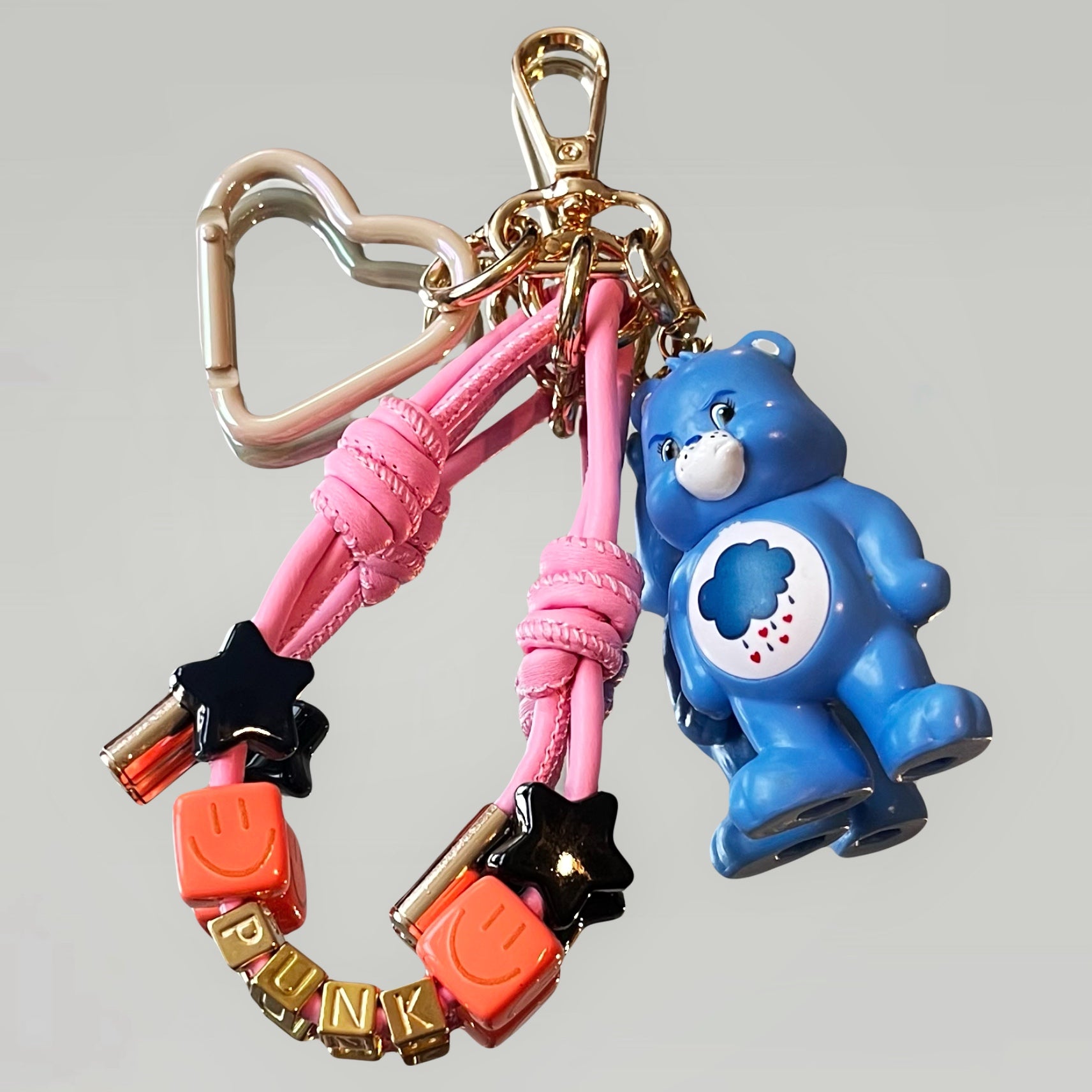 Ce grigri se compose de trois éléments : un mousqueton, un cordon en simili cuir orné de perles, et un petit jouet soigneusement chiné.