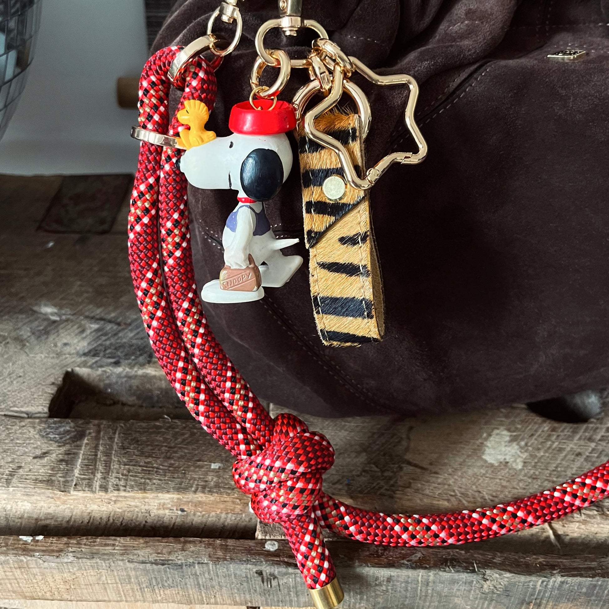 Ce grigri se compose de trois éléments : un mousqueton, une sangle en cuir zébré (porte clé réalisé à la main), et un petit jouet soigneusement chiné.
