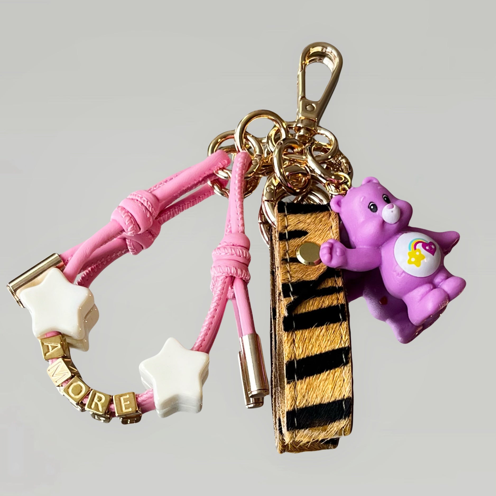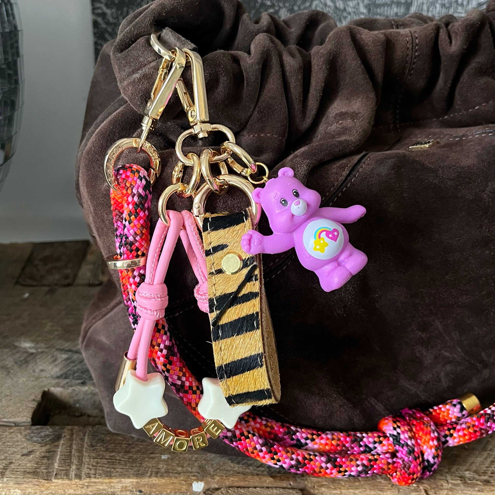Ce grigri se compose de trois éléments : une sangle en cuir zébré (porte clé réalisé à la main), un cordon en simili cuir orné de perles et un petit jouet soigneusement chiné.
