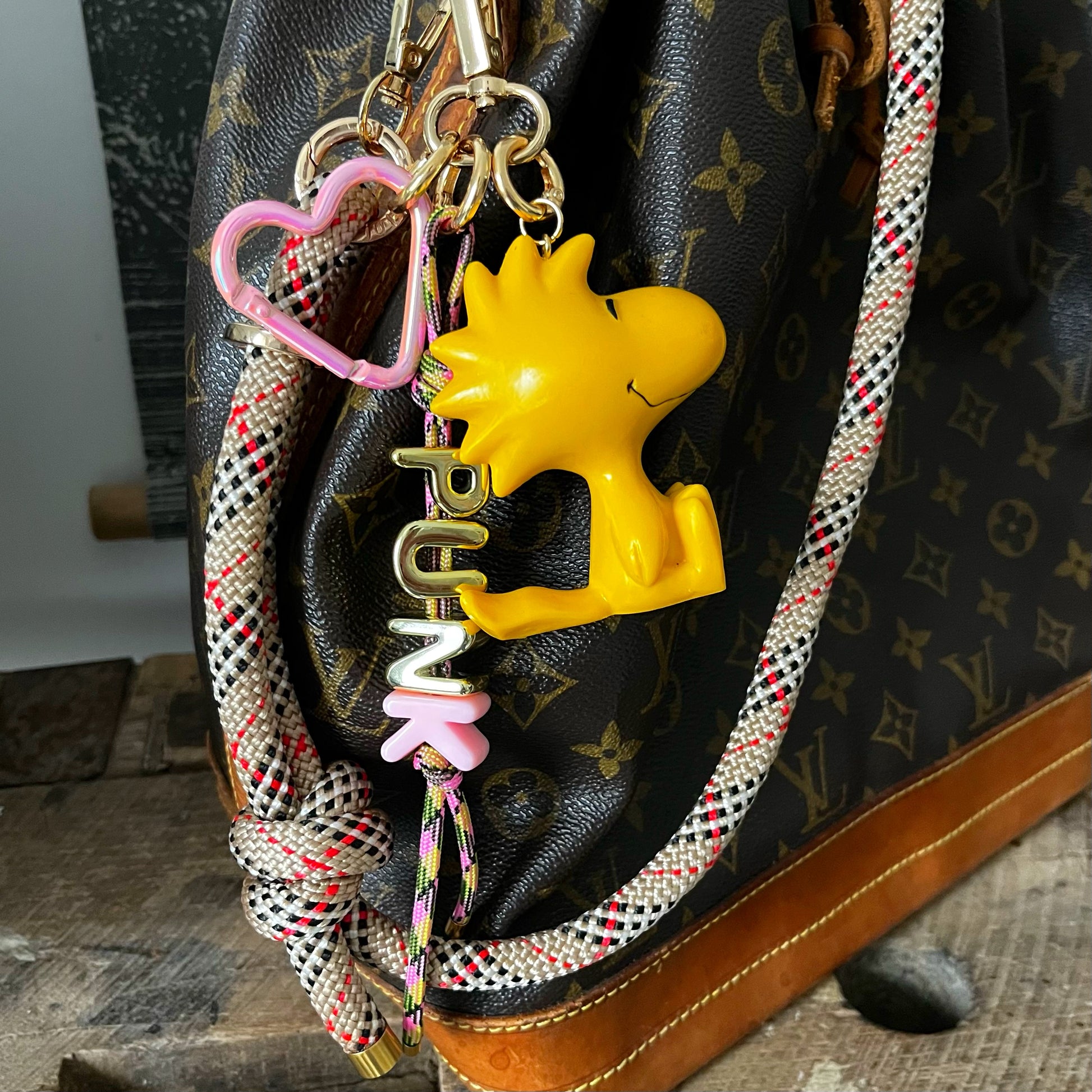 Ce grigri se compose de trois éléments : un mousqueton, un cordon d’escalade orné de perles et un petit jouet soigneusement chiné.