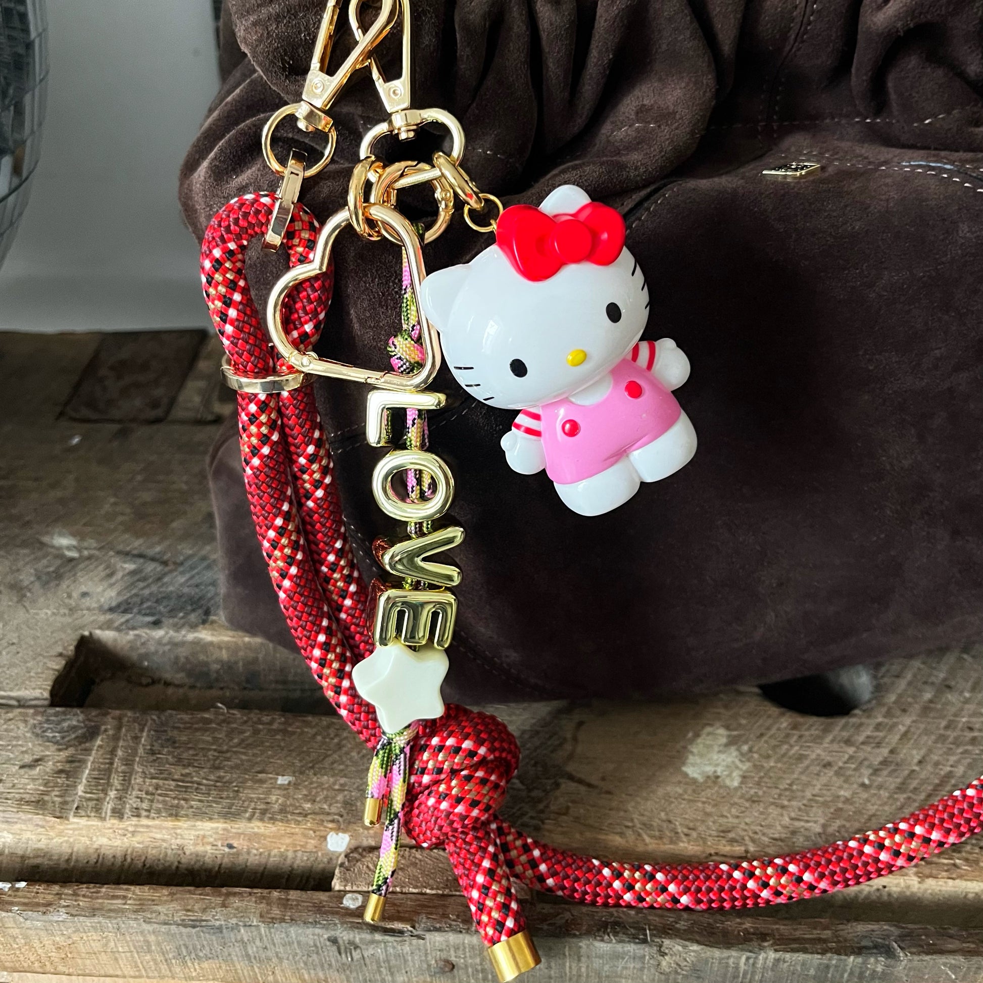 Ce grigri se compose de trois éléments : un mousquetonun cordon en cuir d’escalade orné de perles et un petit jouet soigneusement chiné.