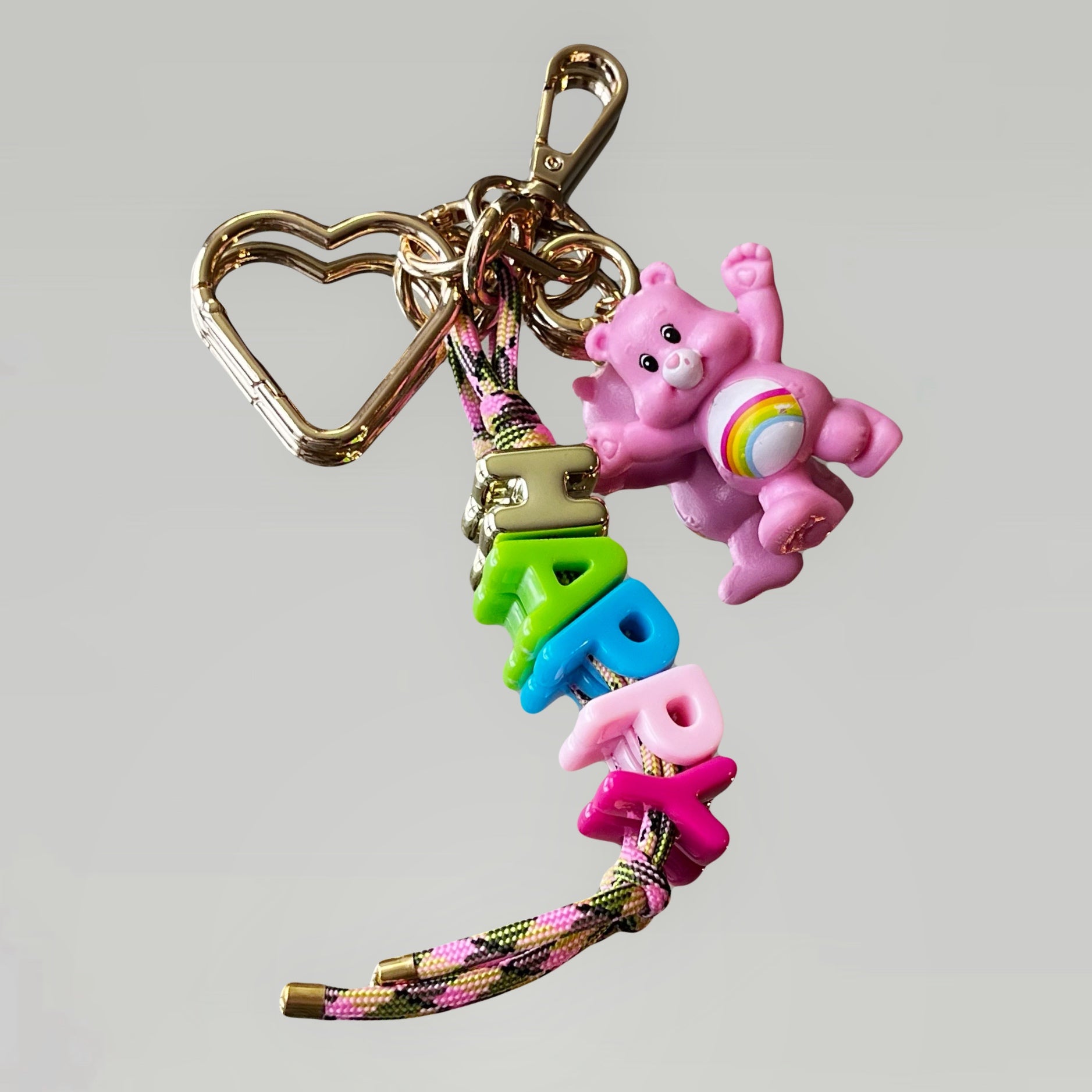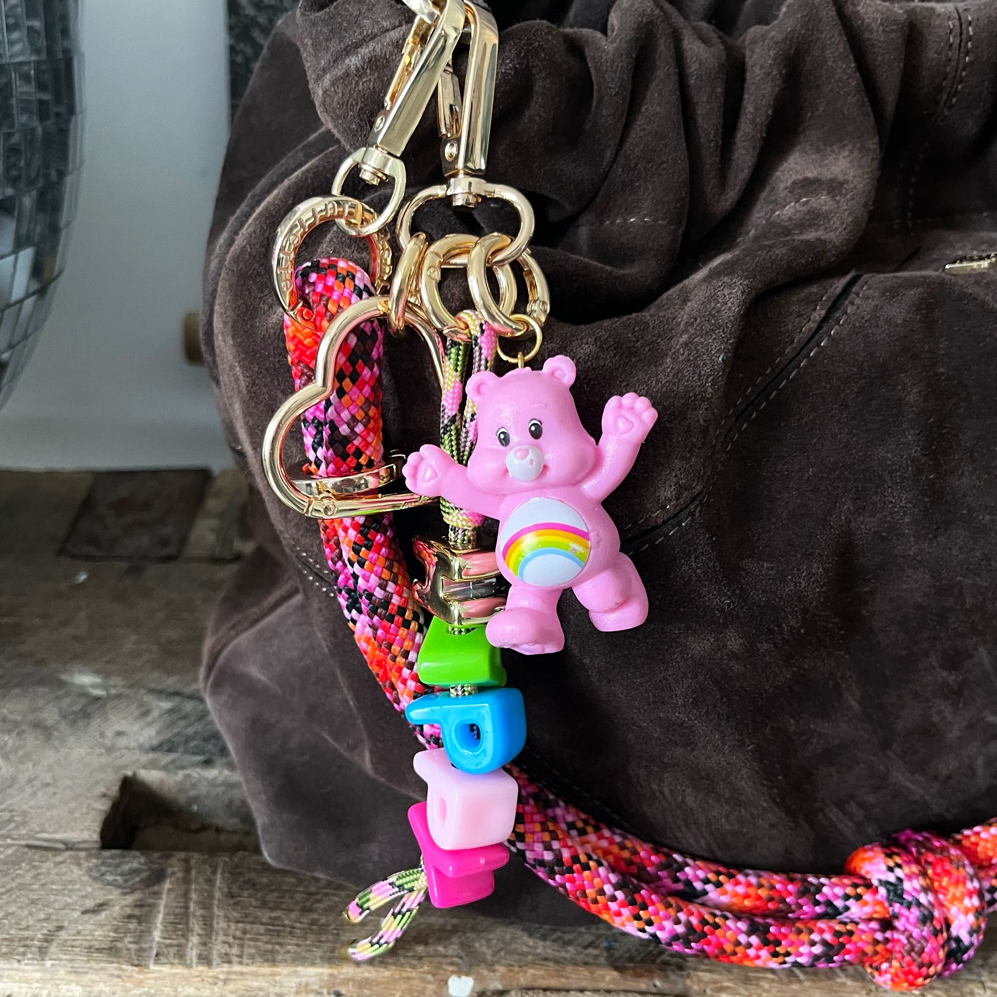Ce grigri se compose de trois éléments : un mousqueton, un cordon d’escalade orné de perles et un petit jouet soigneusement chiné.