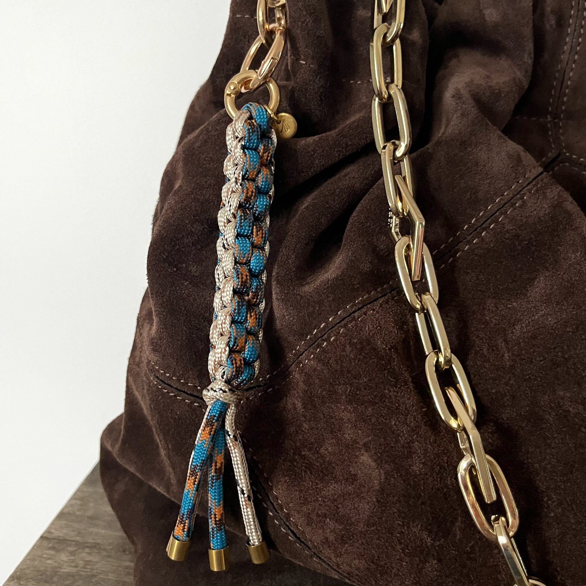 Grigri de sac réalisé en cordelettes d’escalade, entièrement à la main, le mousqueton vous permet de l’accrocher sur votre sac, vos clés, ou vous le souhaitez 😉